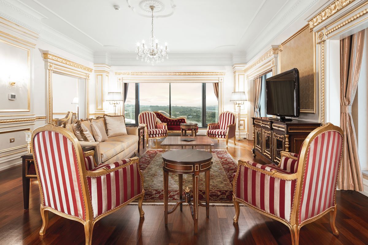 Our Presidential Suite, designed with Ottoman architecture and gold leaf details, span 400 m² and offer the grandeur of Ottoman Palaces with luxurious decor; including a bedroom, study, living room, kitchen, jacuzzi, sauna, and massage room. Additionally, One Rewards members can enjoy exclusive services at the lobby bar with complimentary non-alcoholic or alcoholic beverage vouchers.