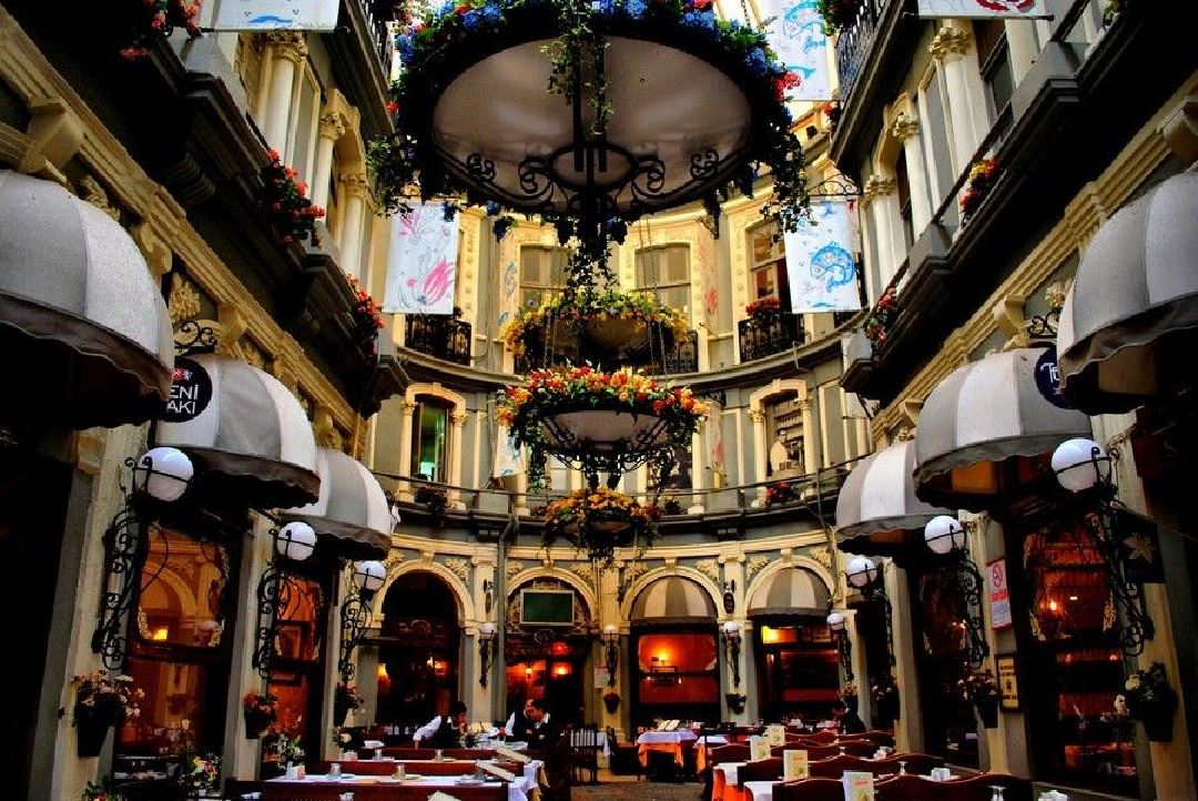 1870 yılındaki büyük Beyoğlu yangınında yok olan Hoca Nazım Tiyatrosu yerine yapılan, mütareke yıllarında birçok çiçekçi dükkanı açıldığından; o güne kadar daha çok Hristaki Pasajı olarak anılan yer Çiçek Pasajı adını almıştır. Asıl olarak 1940’lı yıllarda açılan meyhaneler (özellikle Nektar Birahanesi) büyük bir müşteri kalabalığı çekemeye başlamıştır. 1950’lerde çiçekçiler başka sokaklara doğru kaymaya başlayınca boşalan yerlere yeni meyhaneler açılmya devam etmiştir. 1950’lerin sonunda ‘çiçek’ adı daha çok bir hatıra olarak kalmış, pasaj tümüyle bugünkü meyhane kimliğine bürünmüştür. 10 mayıs 1978’de bir gecede aniden çöken bakımsız bina 2005’te tekrar hizmete girmiş ve şimdi fasıl eşliğinde rakı, balık, meze sevenlerin hizmetindedir.